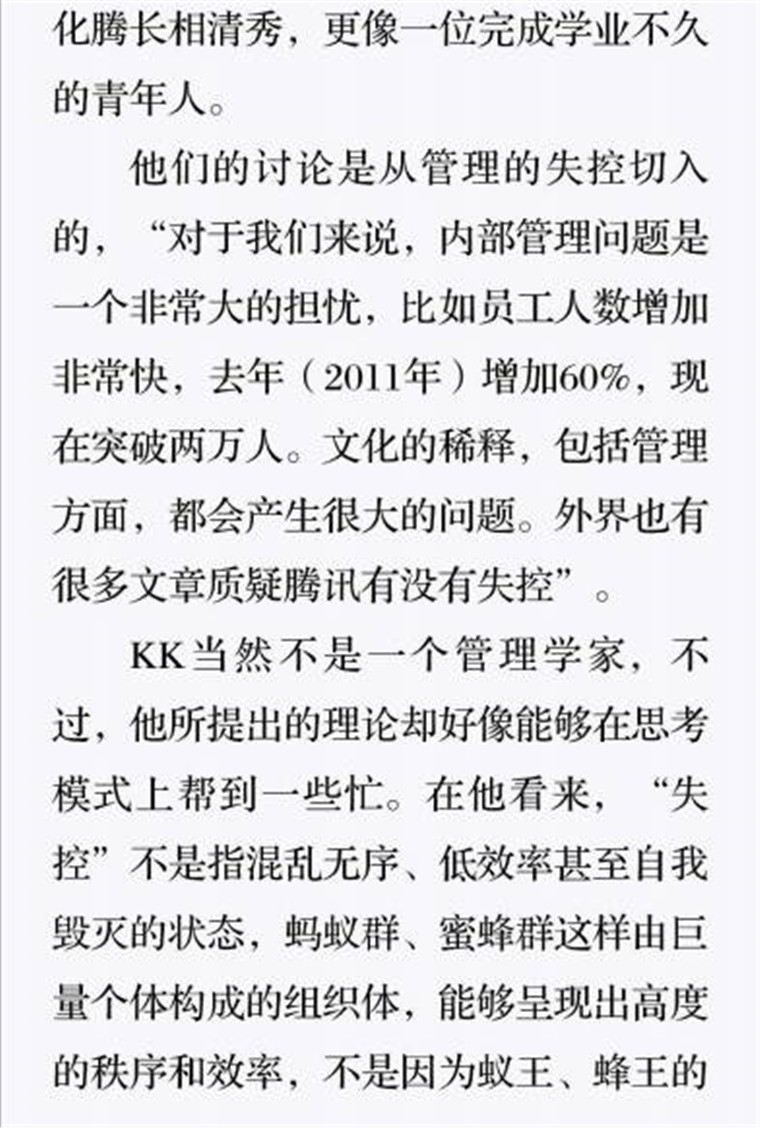 深读之后发明,,,,,,着实全书真正的焦点在于透过腾讯可以视察到的中国企业逻辑,,,,,,其中许多基于国情而降生的特殊能力,,,,,,已往或受诟病或被追捧,,,,,,而本书作者可以以越发客观的姿态对其举行剖析,,,,,,这无疑是一种今世创业者和企业家应当学习的姿态和能力。。。。。。。